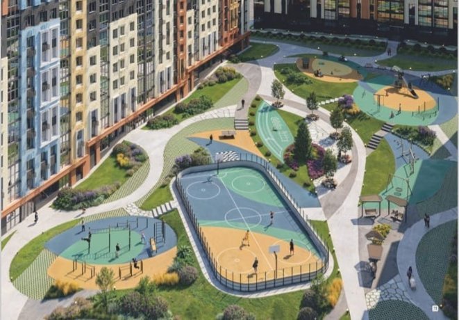 Территория двора разбита на множество тематических и функциональных зон - от комфортных зон отдыха и площадок для спортивных занятий фитнес - оборудованием до красочных цветочных островов всплывающих посреди прогулочных зон.