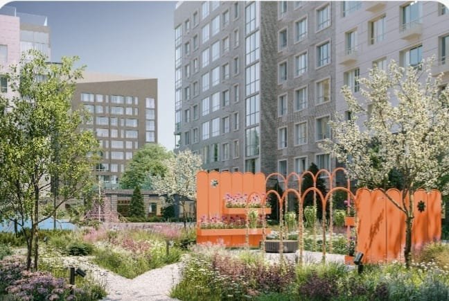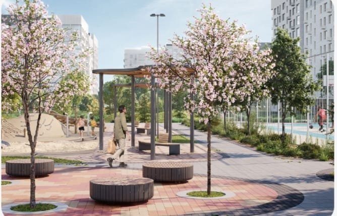 Ландшафтная геопластика. Общественные палисадники, озеленение с цветущими деревьями.