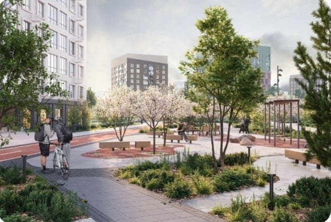 Благоустройство с особым вниманием к ландшафтному дизайну. Это удивительное место в окружении цветущих деревьев с интеграцией реки Правая Берёзовая. Вдохновением озеленения служит плодово-ягодный питомник им. Лукашова, а проектные решения дворов основаны на трёх концептуальных составляющих: тайга, сопки и сад.