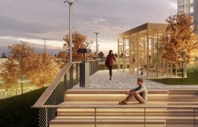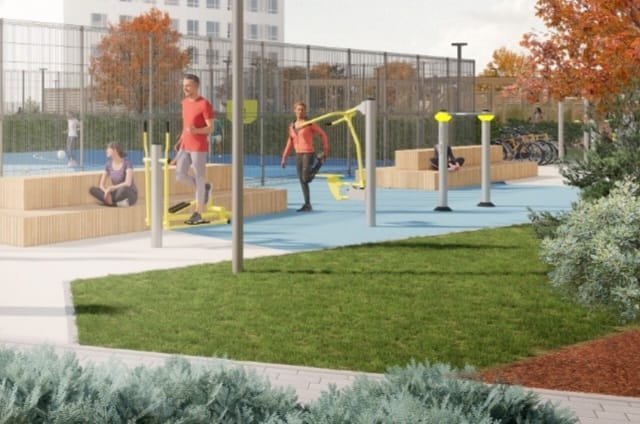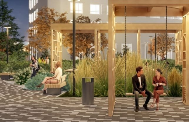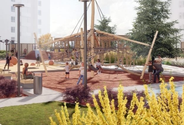 Территория двора поделена по возрастам и сценариям времяпровождения. Отдельная спортивная площадка и воркаут. Детские площадки для дошкольников и детей постарше. Зоны отдыха для взрослых и прогулочные маршруты, которые ведут к пруду, для семейного отдыха и соседских мероприятий. Среди малых архитектурных форм встречается фирменный узор проекта, связывая облик двора с декором фасадов и дизайном холлов.